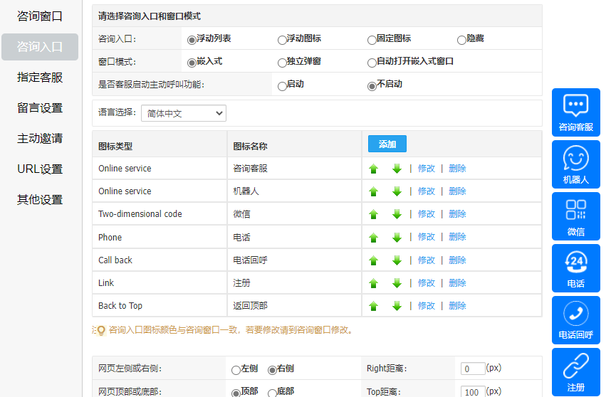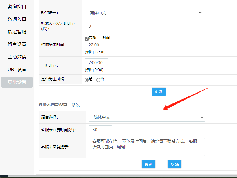 訪客可在客服休息時(shí)間或忙碌未及時(shí)回復(fù)時(shí)將自己的聯(lián)系方式留下,等待客服回呼解決問(wèn)題,可在“系統(tǒng)設(shè)置-媒體對(duì)接-網(wǎng)頁(yè)(網(wǎng)站)-設(shè)置-咨詢?nèi)肟凇?/span>
